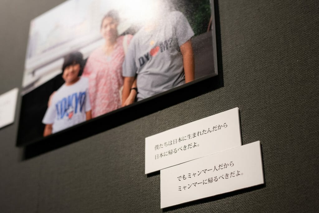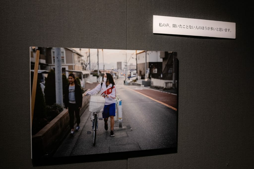 田川:よくあるドキュメンタリー写真展だと、写真を額装して展示して、その脇に小さいボードがあって、例えば「2018年3月、群馬県大泉町のブラジル人学校で撮影」などと書かれている感じなんですけど、それだと書いてあることが「情報」になってしまって、言葉としての強さをあまり出せないのでそうしませんでした。