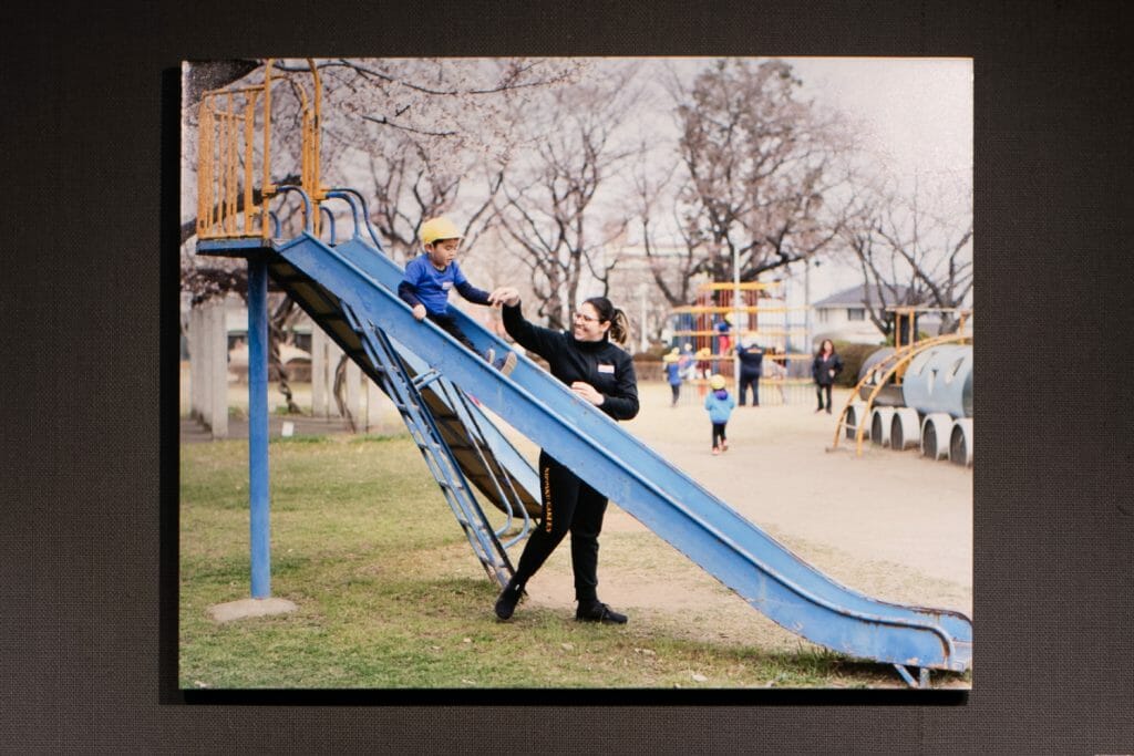 写真の大きさは、言葉で説明するのは難しいんですけど、例えばブラジル学校のすべり台ですべっている子どもの写真。こういう種類の写真は、スマホで見てもあまりたいしたことないというか、細かすぎて細部が見えなくて、あまり面白くないんですけど、プリントして拡大すると、色んなものが想像できたりするんですね。