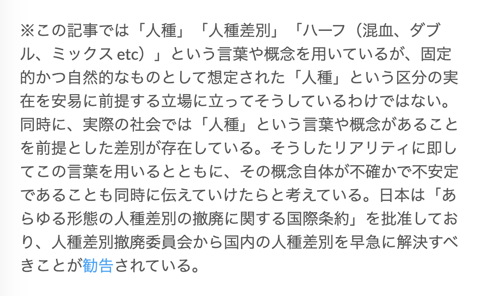 あと、「ハーフ」の記事については、記事が出来上がる前に「人種」という言葉の使い方について望月さんと話をしました。それで「ハーフ」って言うと、「半分」というニュアンスがあったりして、やっぱりそれは「人種」というものを固定化して、その半分という風に読めなくもないけど、そういった意味ではないということを注意書きに書くことになって。