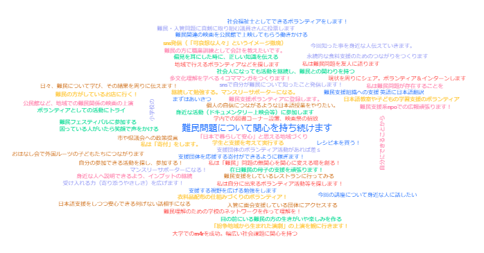 講座の最後にはグループディスカッションを行い、学校、企業、地域などの身近でできる難民支援について意見を出し合い、最後に「私は〇〇をやります!」という宣言とともにそれぞれが身近でできそうなアクションをシェアしあいました。「SNSで自分が難民について知ったことを発信します!」、「多文化理解の4コママンガを作ります!」、「難民支援をしている(難民が経営する)レストランに行ってみる」、「自分にできるボランティア活動に参加してみる」など、さまざまなアクションが出され、ここから新たな一歩を始める決意を皆さんで共有することができました!