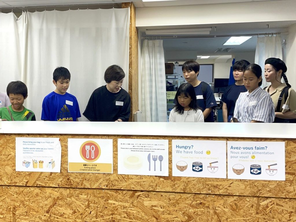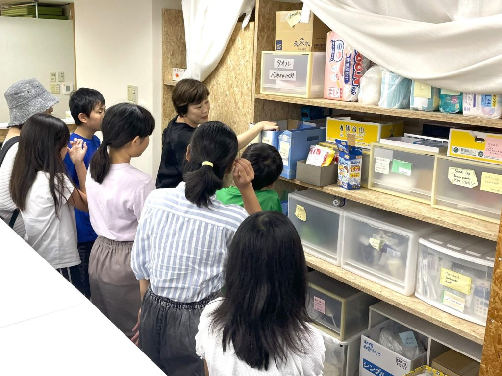 その後、難民の方からの相談を受けたり、支援を行うスペースに移動。難民の方に渡す食料や生活用品などの物資にどのようなものがあるかを実際に見たり、支援活動でどのようなことに配慮しているかなどについて、スタッフから話を聞きました。当日は相談日ではありませんでしたが、子どもたちは熱心に耳を傾けていました。