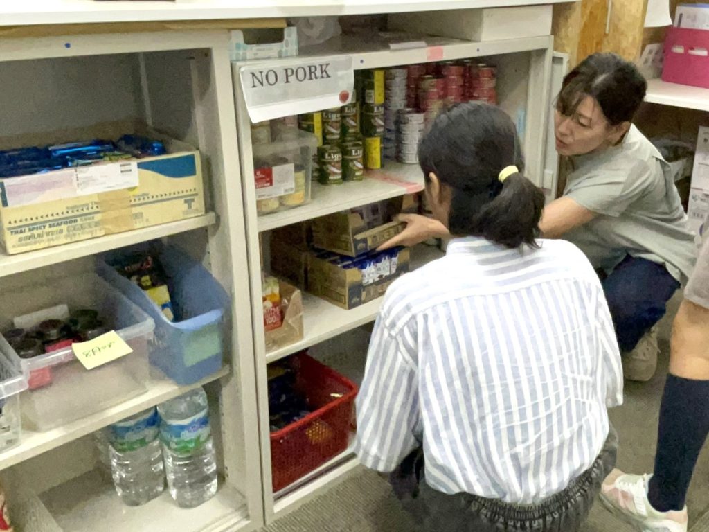 ボランティア体験では、難民の方にお渡しする食料棚の整理を行いました。参加者は初対面同士でしたが、「ぼくはここやるから、そっちお願い!」と声を出しながら、手際よく連携し、あっという間に棚一杯に食料が並びました。
