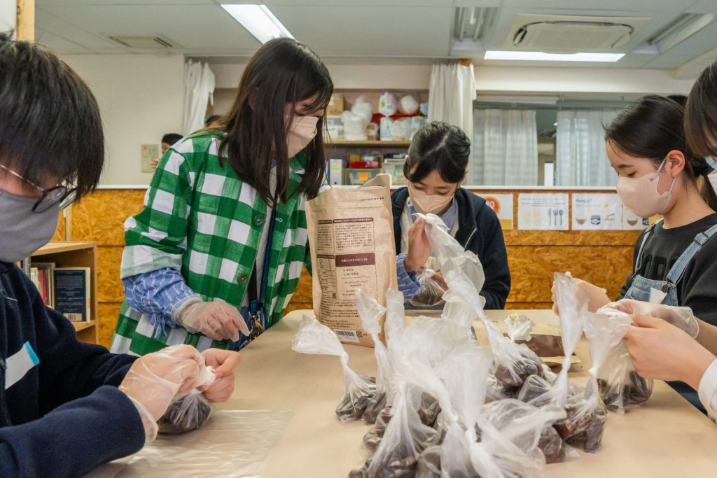 イベント後半では、二手に分かれてボランティアを体験しました。1グループは難民の方への支援物資をカウンターへ補充、2グループは大袋に入った食品「デーツ」を小分けするボランティアでした。