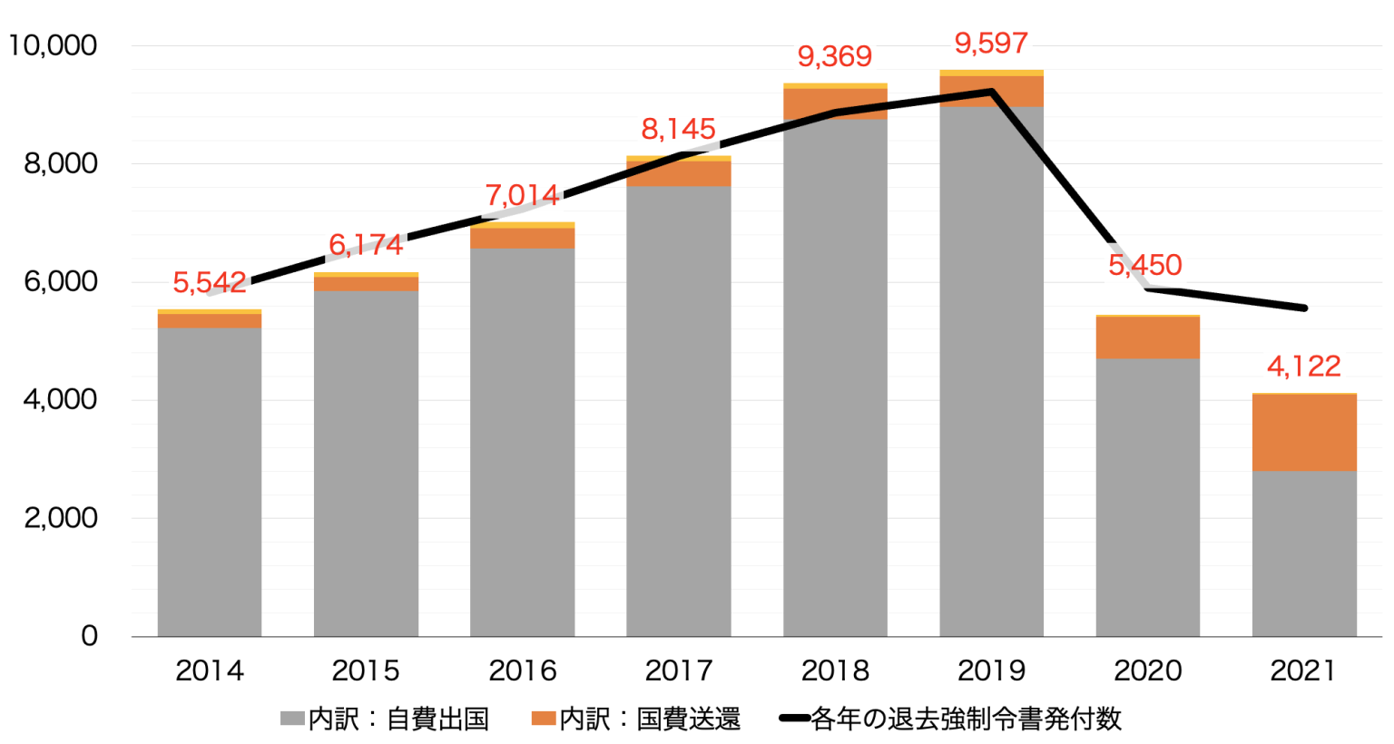 コロナ禍前の2019年に退去強制令書の発付を受けたのは9,218人。同年に送還が実施されたのは9,597人でした。送還には、自費出国や国費送還などの形態があります。9,597人のケースの主な内訳は、自費出国 8,967人、国費送還516人です。