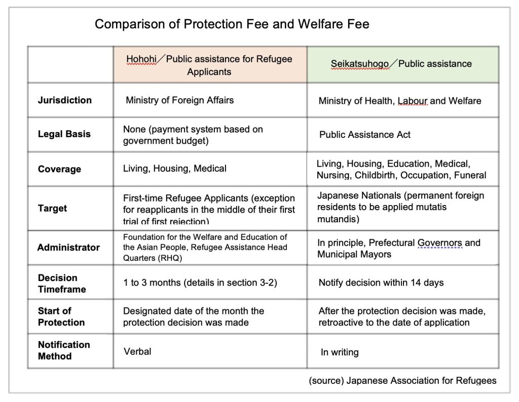 The first major issue is the lack of legal basis (grounding law) for the livelihood protection of refugee applicants.The provision of protection fees started a year after Japan joined the Refugee Convention in 1981, given the fact the Ministry of Foreign Affairs (MOFA) was advised an administrative improvement9 (administrative audit). In other words, administrative measures have been taken without legal basis for the provision of protection fees.