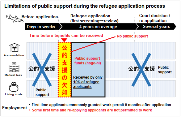 The hogo-hi includes living expenses (1,600 yen/day, 1,200 yen/day for children under 12 years old), housing expenses (single person: 60,000 yen/month, family of 4: 80,000 yen/month), and medical expenses (payment up front). It is the only public assistance and safety net for refugee applicants who have just arrived in Japan without work permits or housing and are in dire straits. However, as shown in the diagram above, the waiting period for payment of funds is long (see 3-2 for details) and leads to some people becoming homeless during that time.