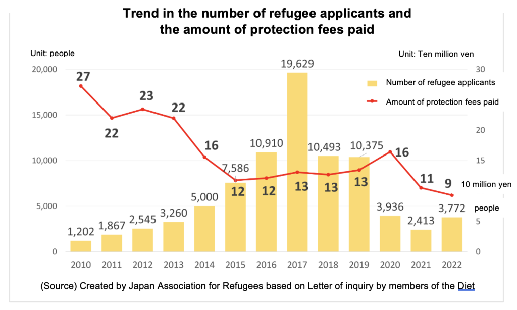 The number of refugee applicants fluctuates each year, influenced by international circumstances and immigration control policies of each country. It is necessary to establish a mechanism that allows to adjust the protection fee budget, in line with the fluctuation of refugee applicant numbers, that can quickly respond to any changes in the field. In the past (2009), many of the refugee applicants were neglected and dismissed without any vital support, as provisions were discontinued due to the exhaustion of the protection fee budget10. In addition, delays in the protection fee process have become common, some taking more than 6 months. It is essential to have a legal basis that secures the “Protection Fee” for refugee applicants to avoid these issues.