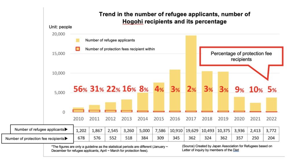 - Because the year of applying for refugee recognition and the year of receiving the protection fee do not necessarily match, and that statistics are captured in different periods (January to December for number of refugee applications, and April to March for protection fees), the percentage of protection fee recipients are only for reference.[↩]