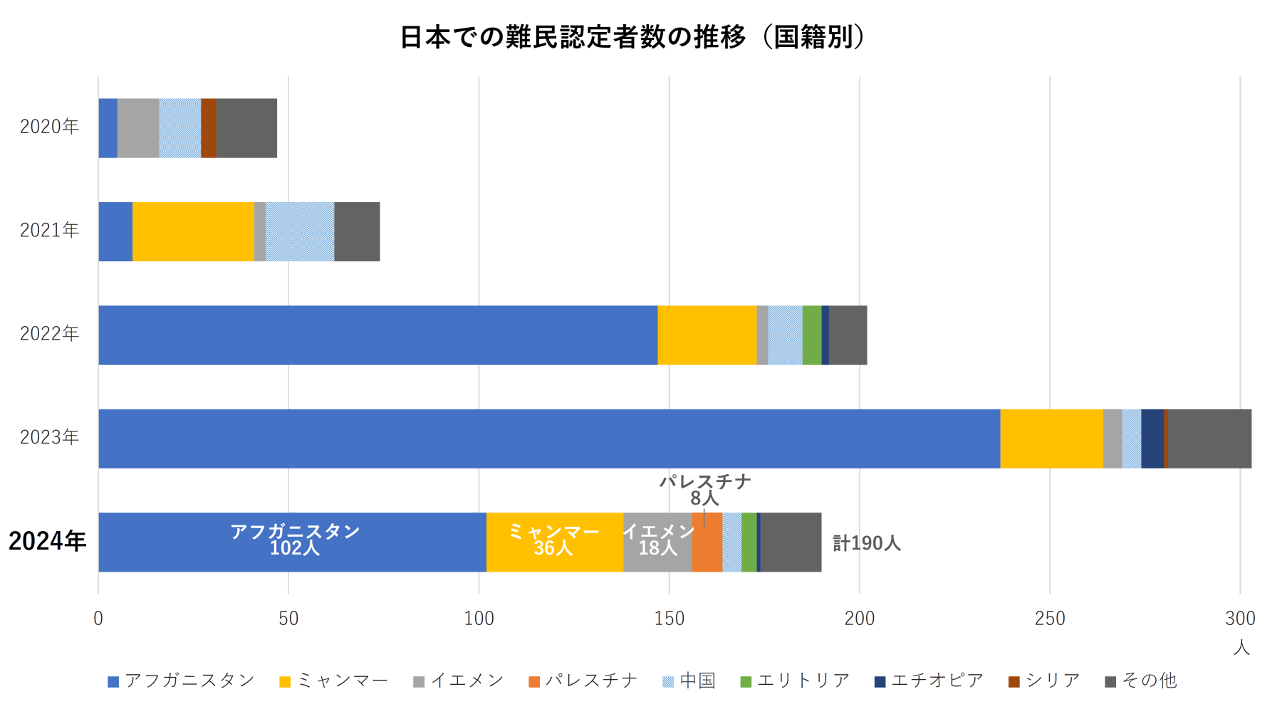 ※注:同年に申請受付ないしは認定等判断がされた人の数である。難民認定等の結果は、前年までの申請も含まれており、2024年の申請数に対しての結果であるとは限らない(つまり、例えば、190人の難民認定者数は、12,373人の申請者数を分母としない)。
