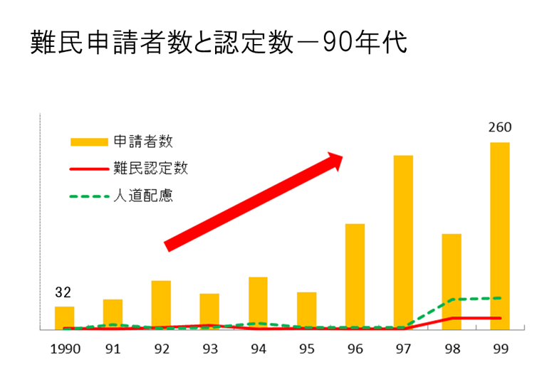 インドシナ難民の受け入れが政府主導で進められた一方、その後世界各地から日本にたどり着いた方々の受け入れについて政府は極めて消極的でした。難民条約にはインドシナ難民の受け入れをきっかけに加入し、難民認定制度も整備したものの、実際に難民として認定される人の数は95年1人、96年2人、97年1人と本当に少ない数でした。