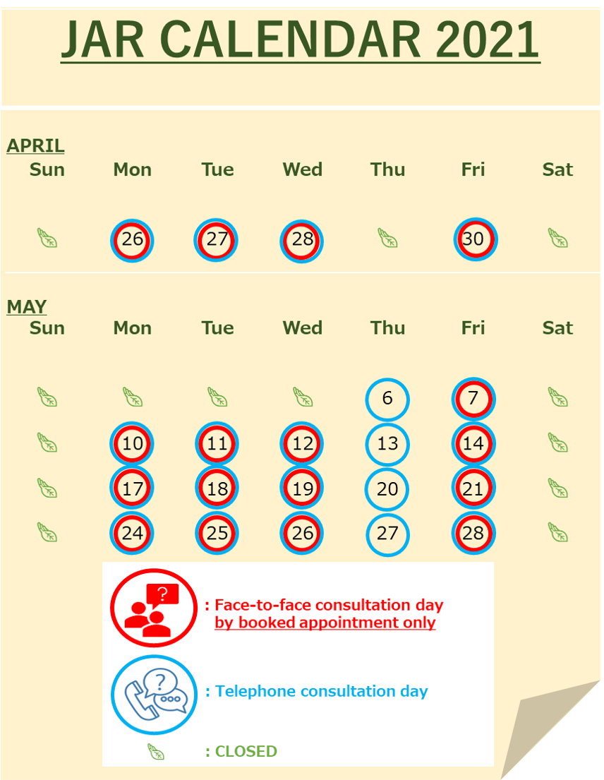 JAR office will be closed on 29 April, 3 May, 4 May and 5 May and JAR telephone consultation will also be closed during those days.
