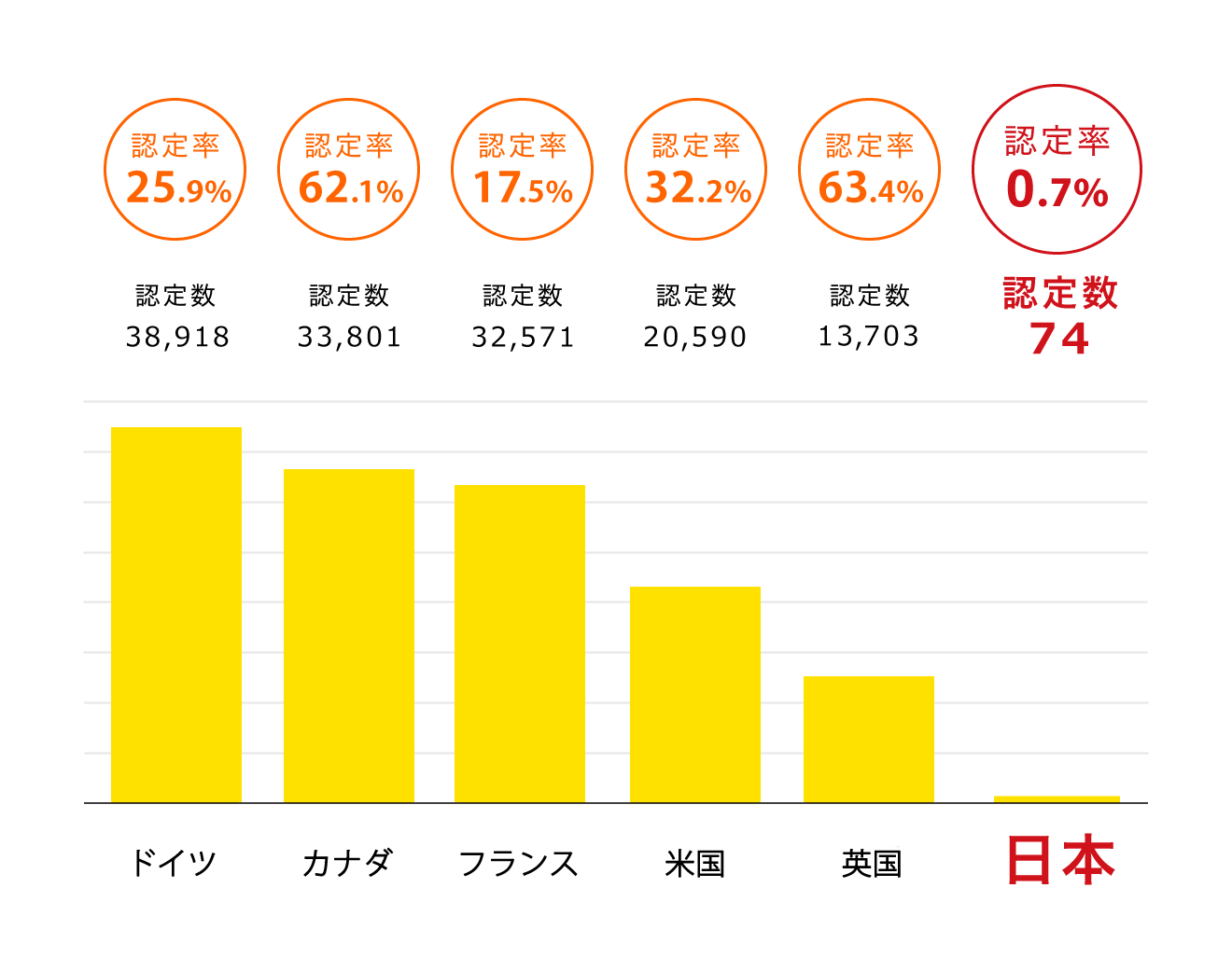 (参考)申請をした年と結果が出る年が異なることが多いため、その年の認定数を同年の「申請数」で割る計算は正確ではなく、国際的に上記の算出方法が採用されています。