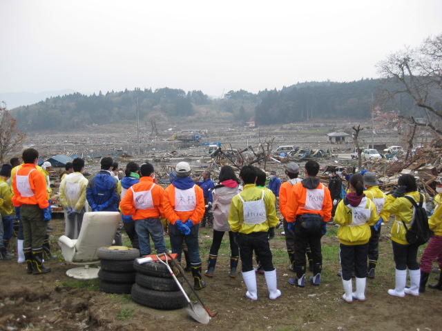 津波で流されたビニールハウスの除去作業、リンゴ園での瓦礫撤去、小学校前の歩道を覆い尽くした泥の除去など、やることは様々。震災から2ヶ月少しが立ち、瓦礫の中から所々、平たい大地が見えてきました。少しずつ、前に歩んでいる被災地の姿を感じます。
