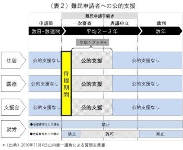 日本に逃れてきた難民申請者の困窮の背景には、結果が出るまでの長期にわたる待機期間の公的支援が十分ではない現状があります。その上、限られた公的支援金の審査にも長期間かかり、通常数か月におよびます。また、難民申請時に正規の在留資格がない場合は、就労することが認められず、自力で生きる糧を得ることができません(表2)。