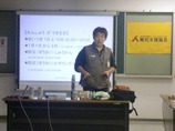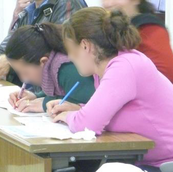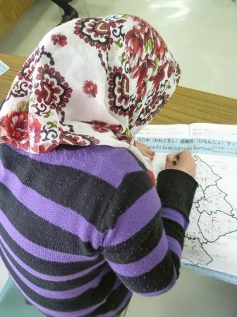 ワークショップ終盤では、日本語講師・内田氏が、「禁止」や「危険」などの標識を交え、緊急の際にすぐに使用することのできる簡単な日本語を指導しました。学んだ漢字を早速災害ハンドブックに書き写し、一生懸命練習する外国籍女性姿も見られました。