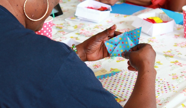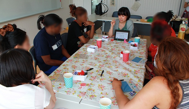 2回目のサロンでは、折り紙とディスカッションを行いました。ほとんどが初挑戦という折り紙。5月のこどもの日と母の日にちなんで、かぶととカーネーションを作りました。「手順が早いよ~!」と慎重に端と端をあわせ、隣同士教えあいながら折りすすめます。出来上がったかぶとを頭にのせたり、広げたお互いのカーネーションを見て、「きれい」あるいは「なんか変~!」と笑う彼女たちのリラックスした表情が印象的でした。