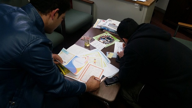難民が多く暮らす地域でワークショップも開催。カードの使い方や問診表の記入を学びました。はじめは思うように進められなかった方も、コツをつかむと自力で利用できるようになり、自信につながっていました。地域の病院のソーシャルワーカーも参加し、難民が実際にどのような部分で苦労するのかなどを実感しながら、どのようにフォローし歩み寄れば、より病院でスムーズに受け入れられるかを考えていただきました。(写真:難民とカードを作成する様子)