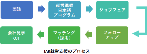 まずは、難民との面談を通じて職種、業種などの希望を確認し、日本語習得を含む3ヶ月の「就労準備日本語プログラム」、難民向けに企業がブースを出す「ジョブフェア」、そこで双方の関心があれば、会社見学・OJT(企業内研修)に進み、企業と難民双方の合意を確認しマッチングを確定、就職後はフォローアップを行います。