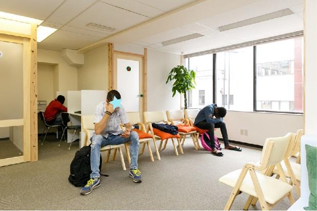 旧事務所の待合室では、狭い空間に順番を待つ方がひしめき合い満員電車のようでした。そこで食事をする人もいれば仮眠をとる人もおり、落ち着くことはできない環境でした。新事務所では以前の約3倍の広さを確保し、大きな窓からは公園が見えます。ゆったりできるソファや椅子を、十分な間隔をあけて設置し、食事専用スペースも設けました。情報を調べるためのパソコンはブースで仕切られ、周りから画面を見られないよう配慮。一人でゆったりする人、談笑する人、食事をする人が、カフェにいるように思い思いに過ごしています。難民の方々の表情にも明らかな変化が見られ、「ここなら一日中、過ごしたい!」「用事は済んだけど、もう少しこの場所を楽しんでから帰ろうかな」といった嬉しい感想が寄せられています。
