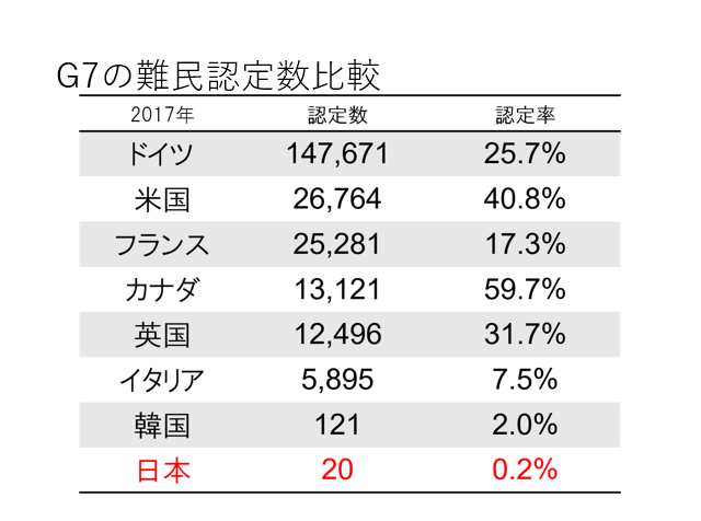 各先進国が最低でも1万人以上を受け入れているのに対し、日本はたった20人しか難民認定されていません。(2017年)