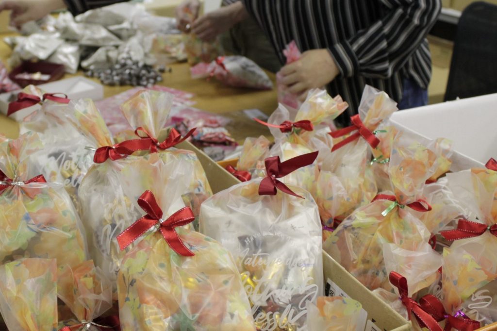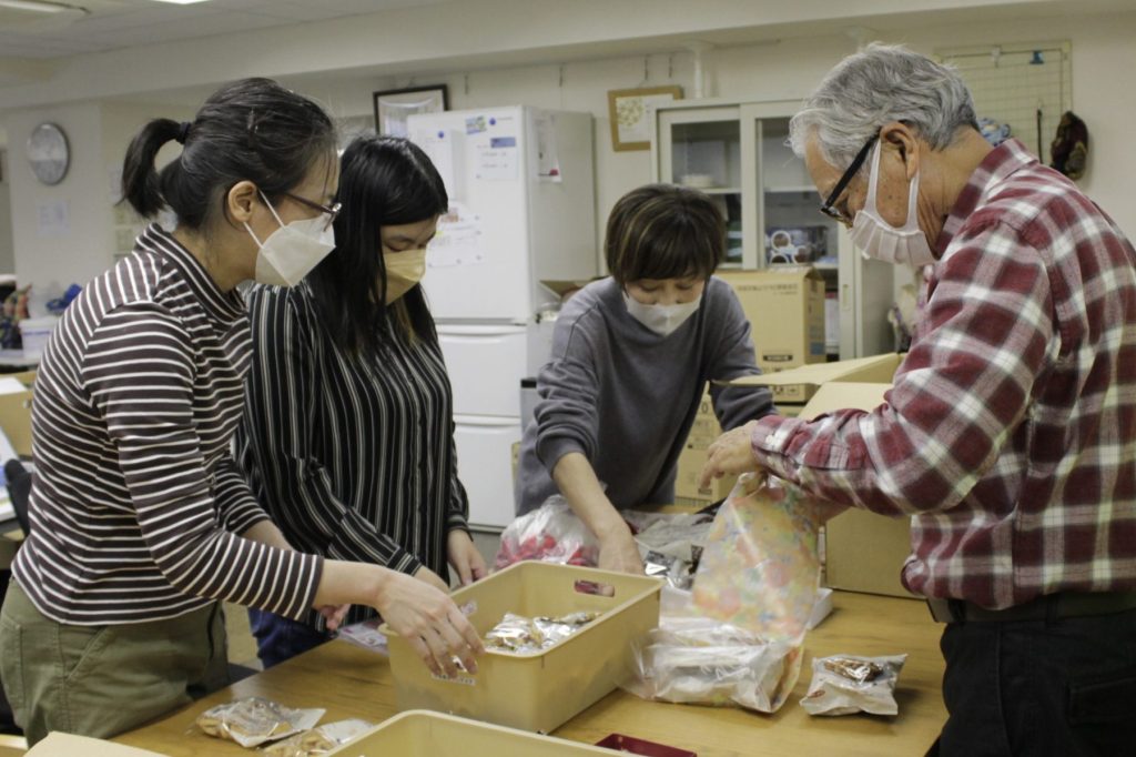 中身はクッキー、あめなどのお菓子。ご寄付から購入したり、支援者の方からいただいたものもあります。3人のボランティアさんが手際よく詰めてくれました。配布は今週金曜日から。