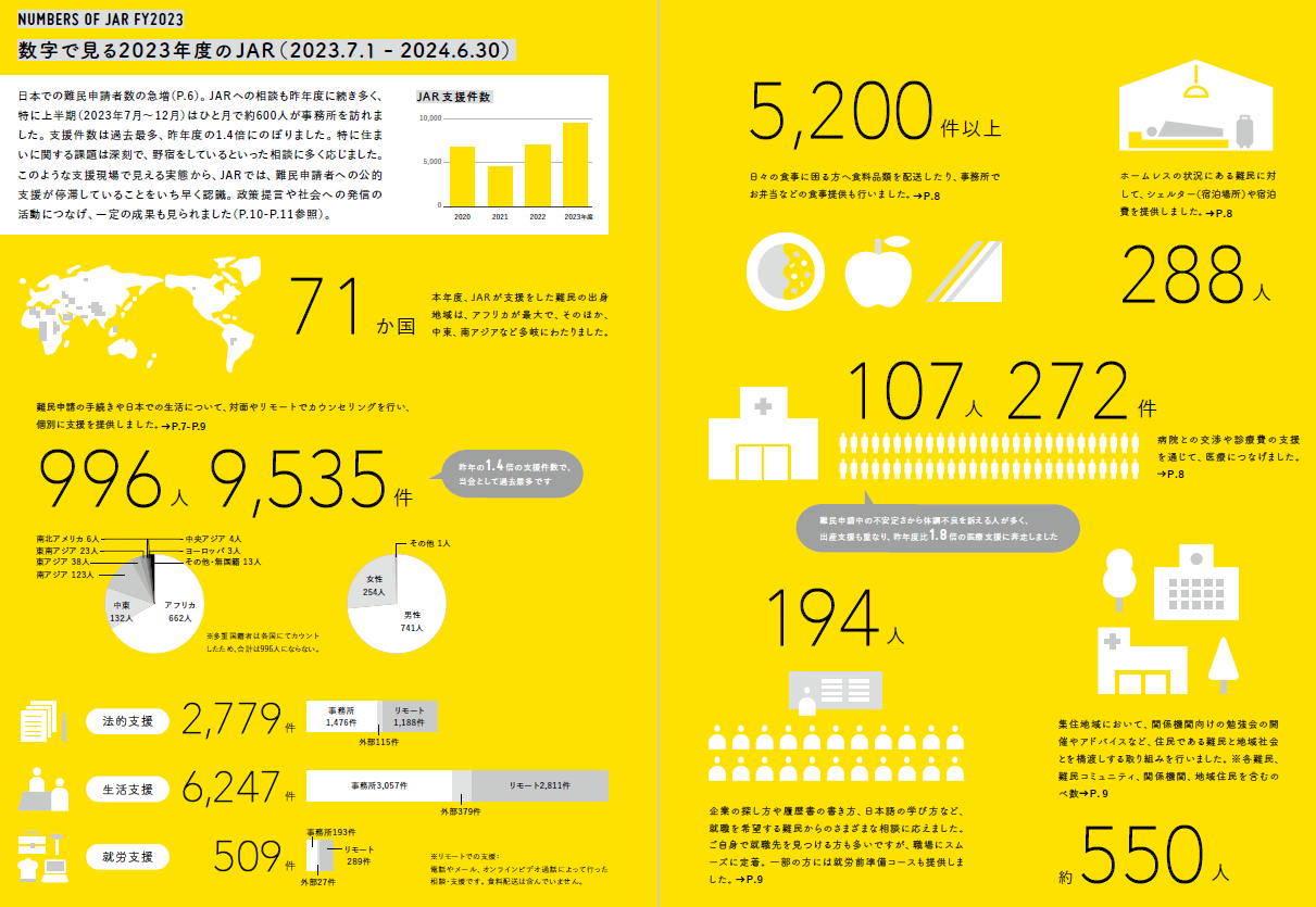 2023年度 年次報告書:動画解説もご覧くださいボランティア・プロボノ寄付広報活動2024.11.252023年度(2023年7月~2024年6月)の年次報告書を作成しました(掲載:2024/11/15)。A4版とともに、内容をコンパクトにまとめたダイジェスト版もあります。詳しくは ▶ こちらからまた、動画でも簡単にご紹介しています。約3分で概要がつかめます。ぜひご覧ください。数字で見る2023年度のJAR企業・団体からのご協力(一覧) ▷ こちら会計報告 ▷ こちら 関連記事:2024年度 年次報告書を作成しました 2025.11.266年越しの難民認定。エチオピアへの帰国を断念、ここが私たちの「ホーム」 2025.11.13入管庁「ゼロプラン」の実施状況に対するコメント 2025.10.10在日クルド人をめぐる「問題」を考える 2025.9.18【オンライン・無料】「日本と難民」入門セミナー 2025.6.25難民支援協会の活動は皆さまからの ご寄付で成り立っています。あなたのワンアクションが、 難民の命と未来を支えます。寄付で支える メールマガジン「JAR便り」登録者募集中!難民の方々の取り巻く状況やJARの活動についてお届けしています。