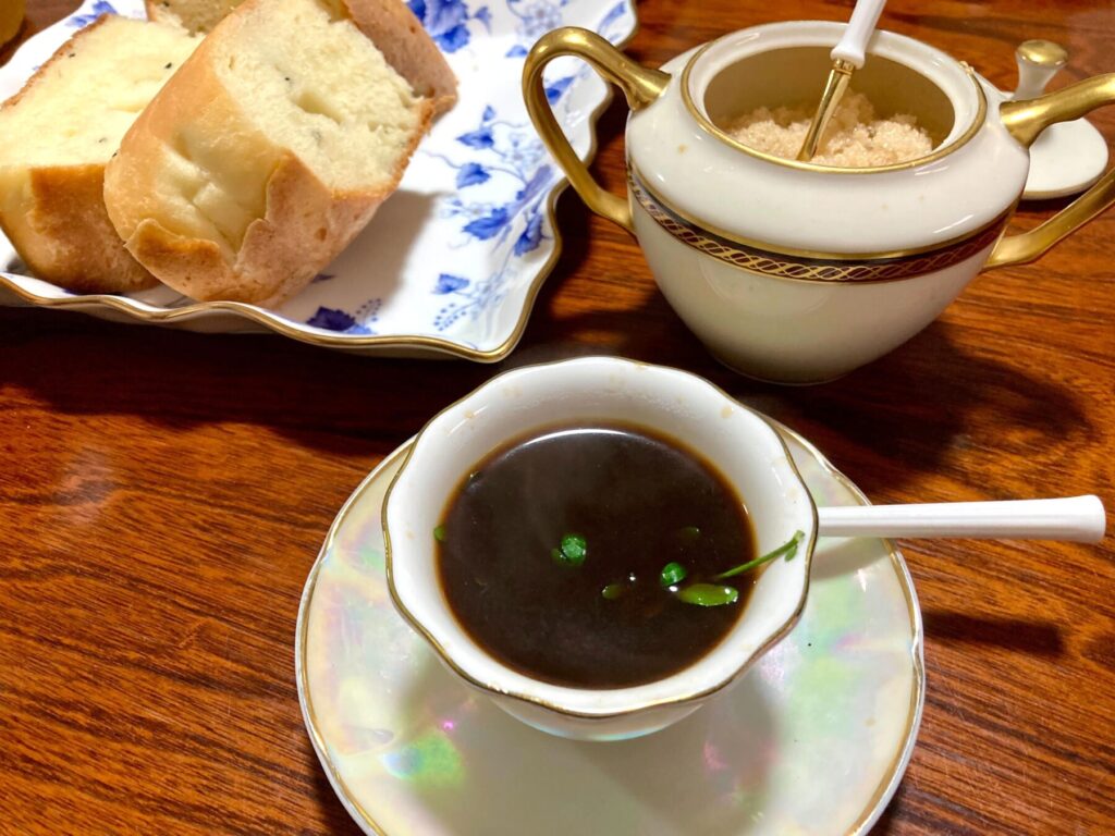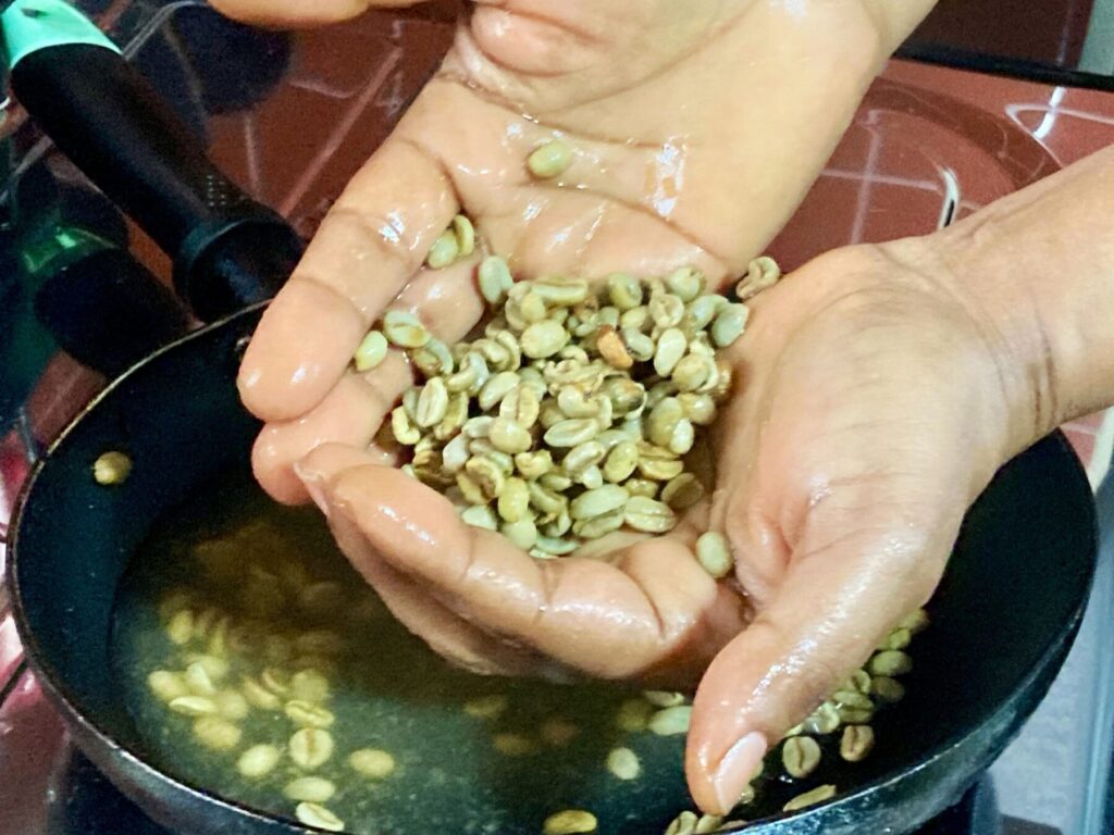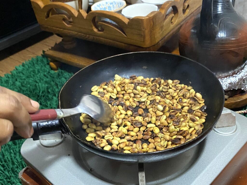 そばで話を聞いていた妻ハンナ(仮名)さんが手際よく準備を始める。生豆を小ぶりのフライパンに入れ、優しくゆすりながら炒る。生豆はそら豆のような青い匂いがする。10分ほどすると豆の表面が艶っぽく黒光りして見慣れたコーヒー豆が現れてくる。香りが徐々に立ち上がる。ミキサーで豆を粉砕すると、さらに濃い香りが放たれる。粉砕した豆をツボに入れて中火で煮だし、温度が下がるのを待つ。ハンナさん手作りのパンをつまみながら、ゆっくりと出来上がりを待つ。