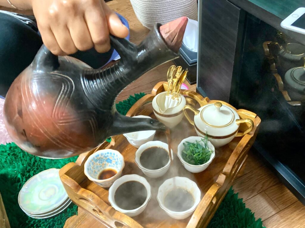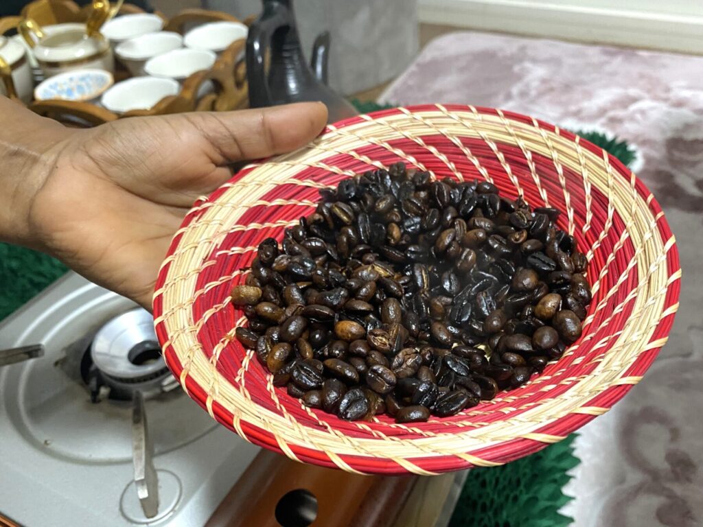 インタビューが一段落すると、アベベさんが笑顔で「エチオピアのコーヒーはどうですか」と勧めてくれた。エチオピアでは、日本の茶道のようにコーヒーを淹れてもてなす「コーヒーセレモニー」という習慣がある。