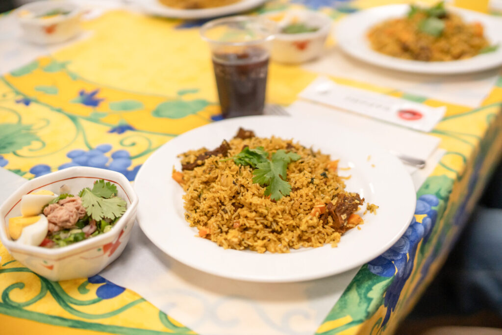 当日は朝10時から約4時間をかけて、慣れない台所で進めてくれました。特にお米は、時間がかかっても丁寧に蒸すことにこだわりました。スタッフが「炊飯器なら簡単ですよ」と声をかけると、「本場のおいしさを味わってほしいからね」と笑顔で返してくださり、プロとしての姿勢に感心させられました。包丁さばきや盛り付けの美しさ、そして目分量で絶妙に仕上げる味付けに、シェフの力量がにじみ出ていました。