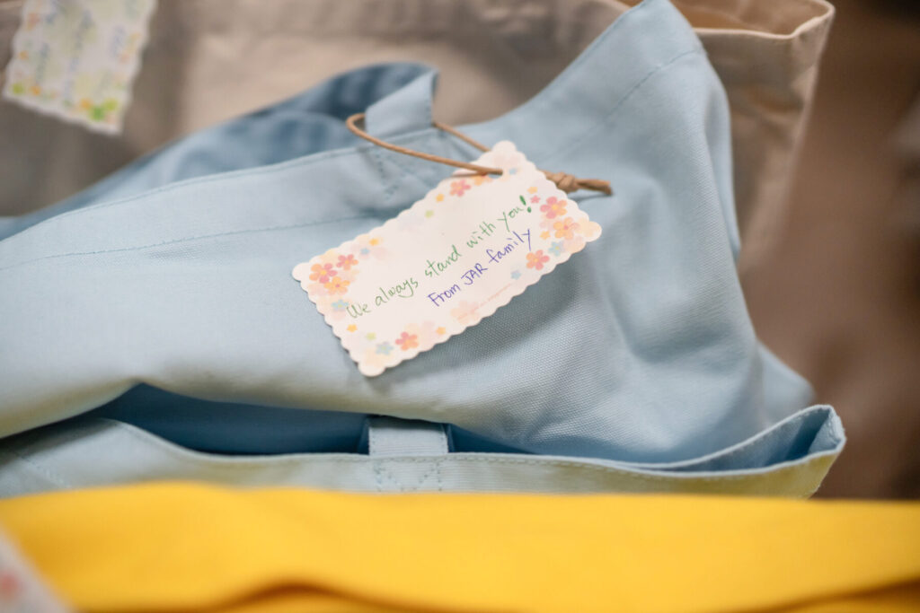 帰り際に、難民の人たちに、スタッフからお土産を渡しました。お菓子などお土産を入れた帆布カバンにはスタッフとボランティアからのメッセージを添えました。