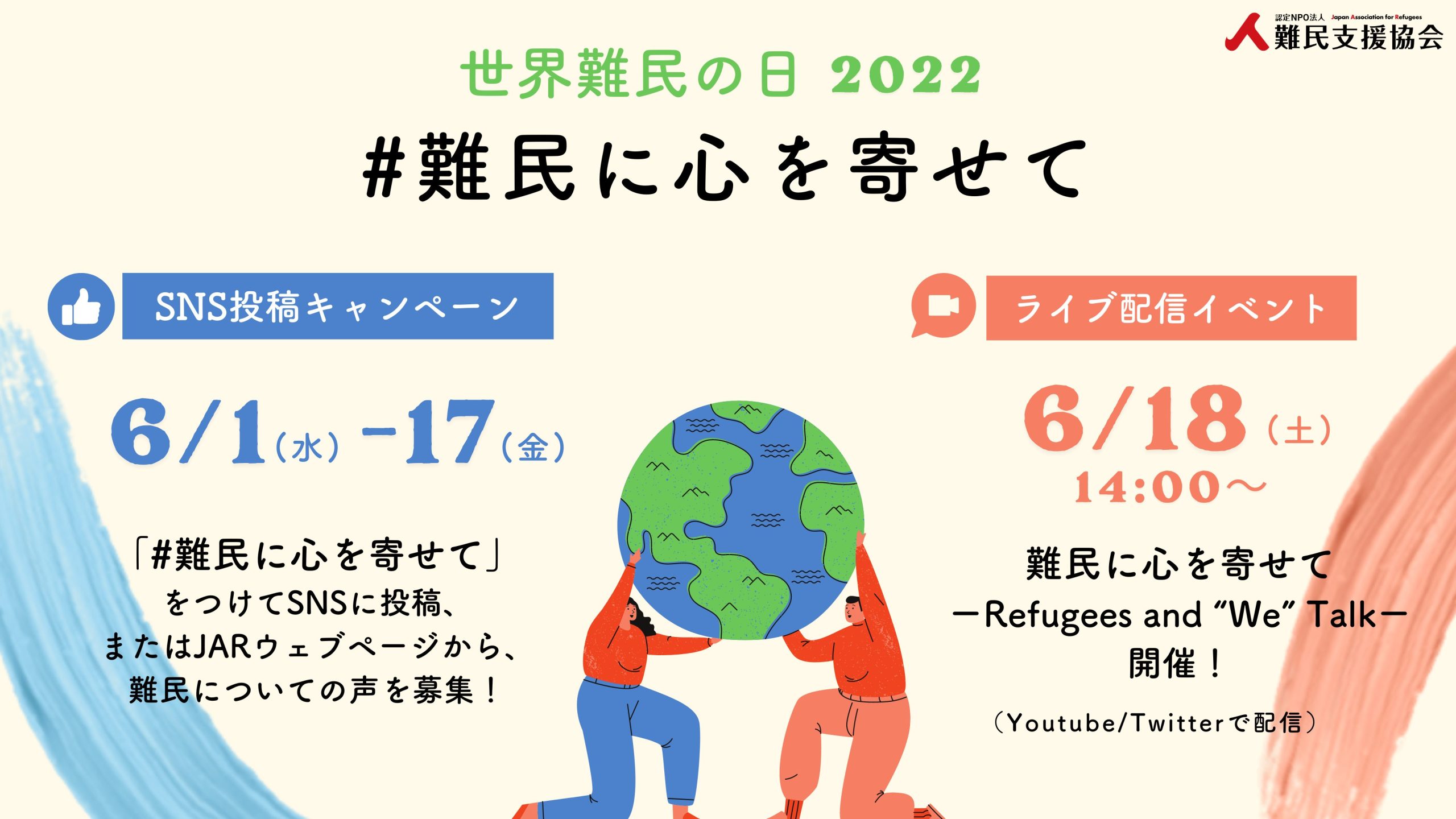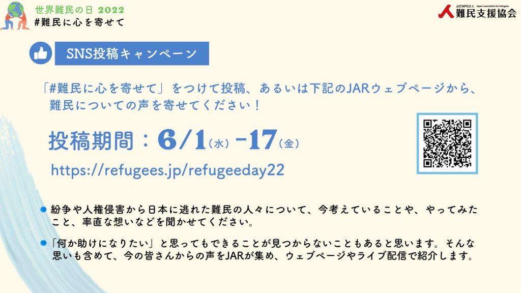 難民支援協会(JAR)では、6月20日の「世界難民の日」に向けて、日本に逃れた難民の人々について、皆さんからの声を募集します。