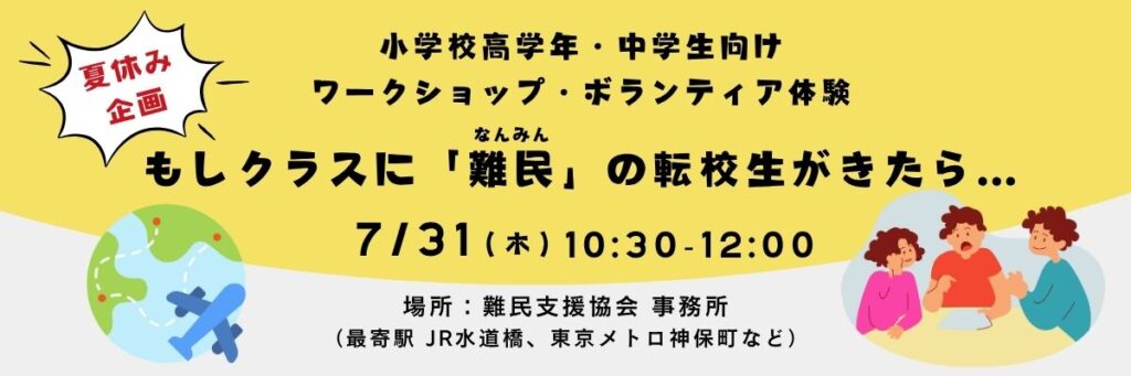 | 対象 | 小学校高学年(4~6年生)、中学生 *対象外の年齢のお子さんで、参加希望の場合はお問合せください。support@refugee.or.jp なお、大人のみでのお申込みは受け付けておりません。 *イベント終了後、ボランティア証明書が発行されます |