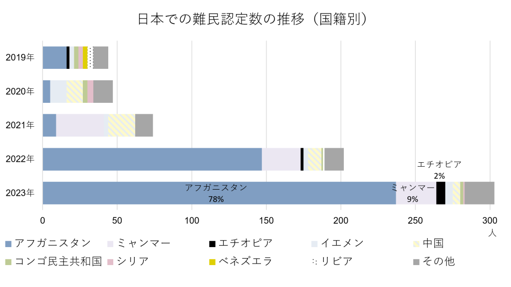 | [難民認定申請者数] 1,867人(内訳:ミャンマー(ビルマ)491人、ネパール251人、トルコ234人、スリランカ224人、パキスタン169、ほか498人) [認定数] 21人(内訳:ミャンマー18人、ほか3人) [人道配慮による在留許可数] 248人(内訳:ミャンマー196人、ほか52人) |