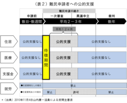 日本に逃れてきた難民申請者の困窮の背景には、結果が出るまで長期にわたり待機をしなければならず(異議申立期間を含めると、2年を越える事が一般的です)、その間の公的支援が十分ではない現状があります。公的支援を得るに当たっても審査に長期間かかり、通常数か月におよびます。また、難民申請時に正規の在留資格がない場合は、就労することが認められず、自力で生きる糧を得ることができません(表2)。就労資格がある場合にも、日本語教育や就労訓練が提供されておらず、職を得るためのハードルは高いままです。