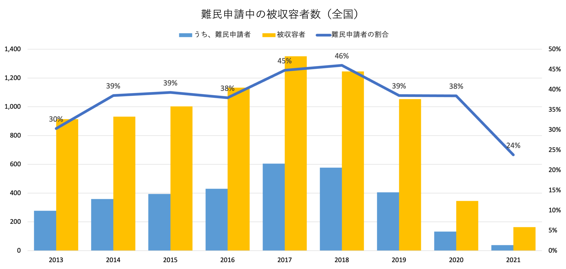 ![難民申請中の被收容者数(全国)[年/被収容者/うち、難民申請者/難民申請者の割合]2013年/914/277/30%, 2014年/932/359/39%, 2015年/1,003/394/39%, 2016年/1,133/430/38%, 2017年/1,351/605/45%, 2018年/1,246/577/46%, 2019年/1,054/406/39%, 2020年/346/133/38%, 2021年/164/39/24%](https://www.refugee.or.jp/wp-content/uploads/2022/01/shuyou_nanmin_2013-2021.png)