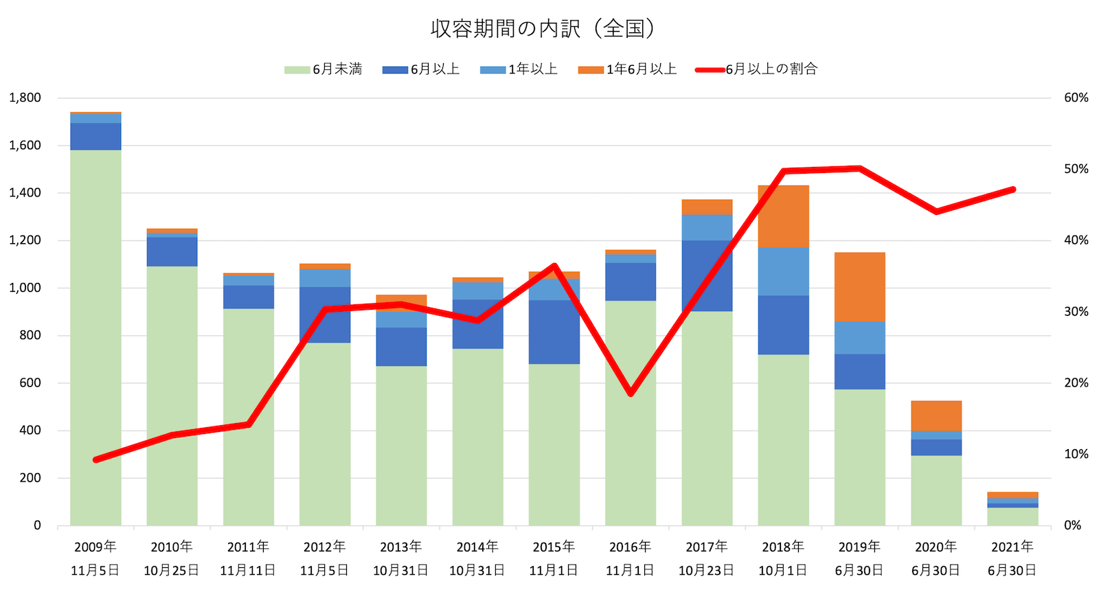 ![収容期間の内訳(全国)[日付/6月未満/6月以上/1年以上/1年6月以上/6月以上割合] 2009年11月5日/1,581/114/38/9/9%, 2010年10月25日/1,092/122/19/18/13%, 2011年11月11日/913/98/41/12/14%, 2012年11月5日/769/236/75/24/30%, 2013年10月31日/671/163/66/73/31%, 2014年10月31日/745/207/72/22/29%, 2015年11月1日/680/269/90/31/36%, 2016年11月1日/947/159/36/20/19%, 2017年10月23日/902/298/109/65/34%, 2018年10月1日/720/249/203/261/50%, 2019年6月30日/574/148/138/291/50%, 2020年6月30日/295/68/36/128/44%, 2021年6月30日/75/19/21/27/47%](https://www.refugee.or.jp/wp-content/uploads/2022/01/shuyoukikan_0911-2106.png)