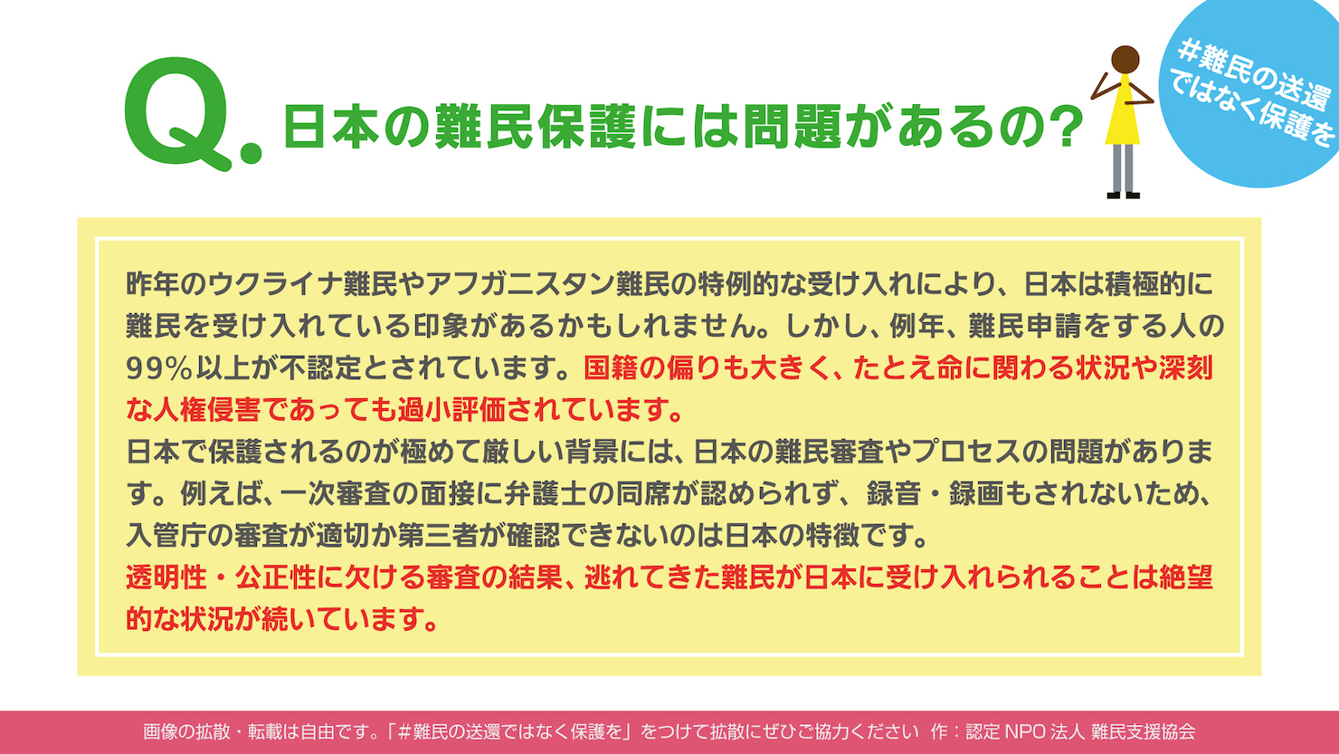 「難民に関する日本のシステムは透明性がないし、(難民保護の)義務を果たしていません。国際法にも反しています。」「難民と連携し、一緒に議論してほしいです。」