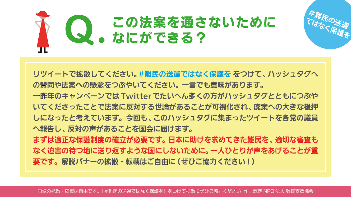 - Twitterをやっておやりませんので、こちらに賛同を表明いたします。 難民の方が命をとられることにつながる、非人道的な改正法案に、反対します。