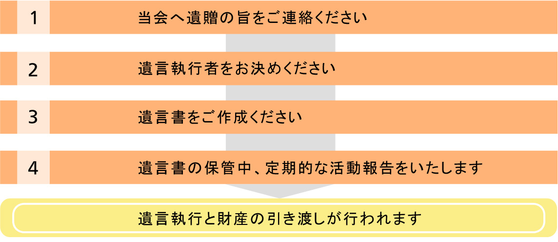 まずは、当会に「相続財産からのご寄付」のご意向をご連絡ください。寄付に至るまでの流れや当会の活動及び支援内容についてご説明いたします。