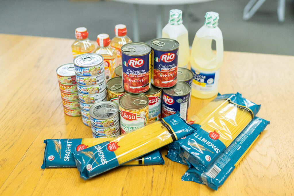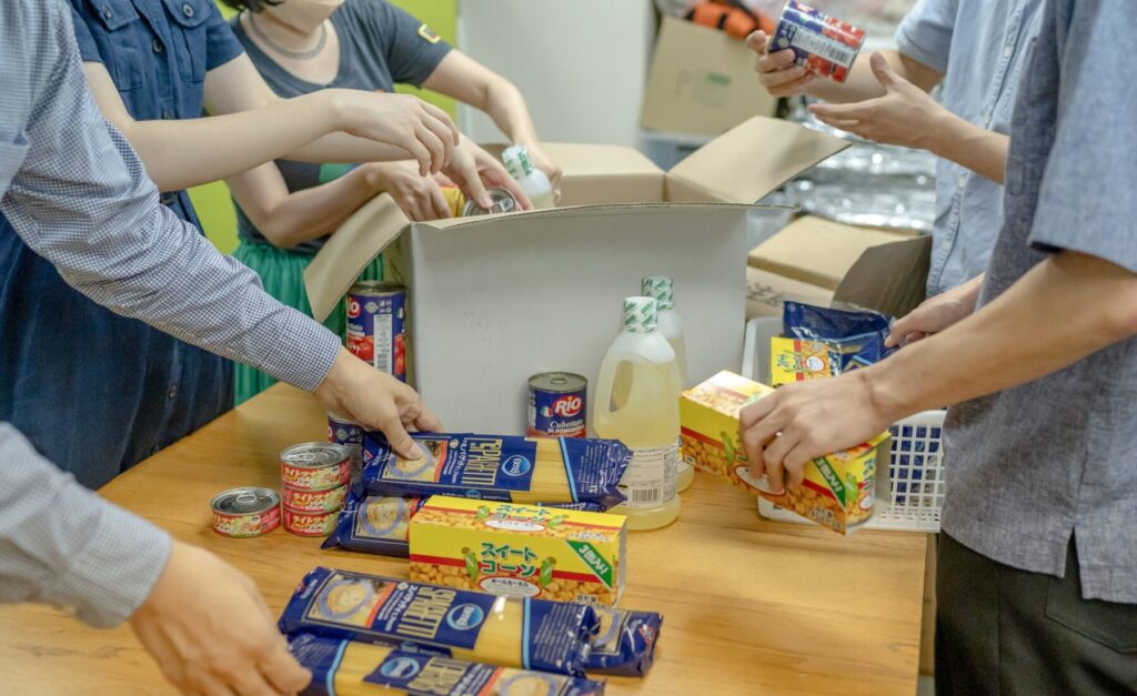 会社の部署のメンバーで家庭にある食料品を持ち寄り、フードドライブをする。