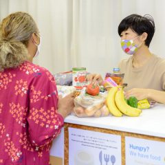 写真:JAR事務所で食料をお渡しする様子。(モデルによる撮影) 長引くコロナ禍で、難民の方への対面での支援が制限される状...